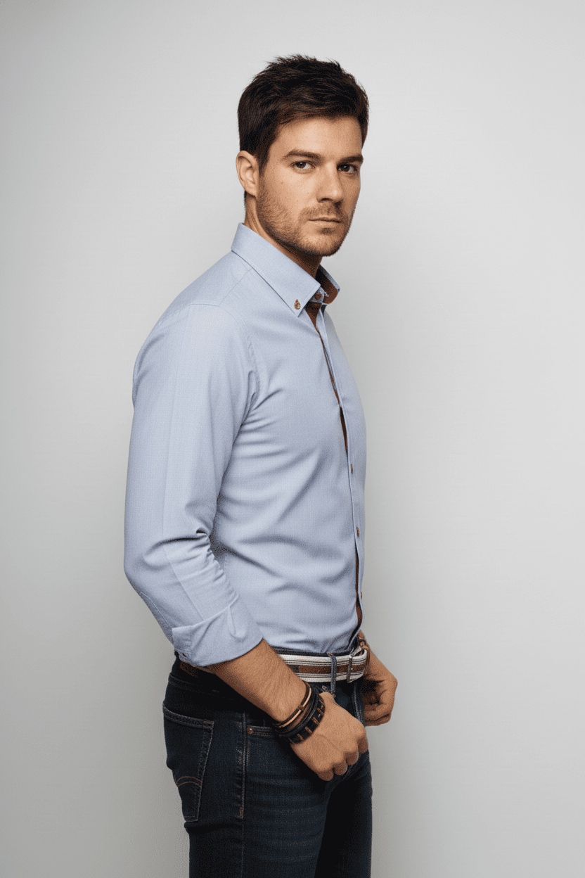 - Detalhes funcionais: gola tradicional, fechamento em botões frontais.